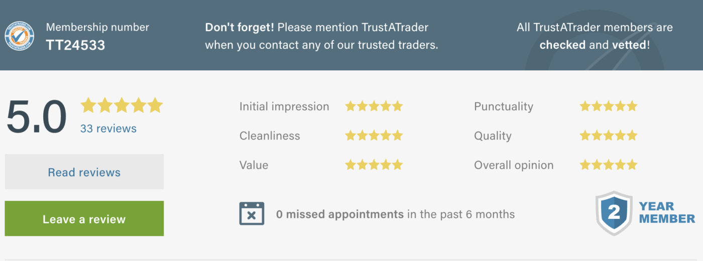 As a proud member of TrustATrader, we work hard to maintain our excellent customer reviews and high standards of service. From the first call to project completion, we aim for complete customer satisfaction.
